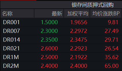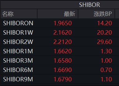 同日,DR001一度冲上3%,创下2023年11月底以来新高。截至17:00,DR001全天加权平均利率为1.97%,较前一日上行约10BP,最新成交价则回落至1.5%。同业拆借方面,上海银行间同业拆借利率(Shibor)隔夜报1.965%,上涨14.2BP。