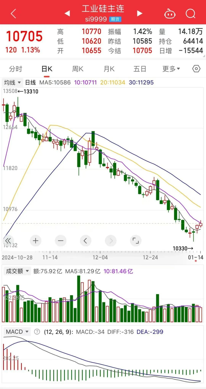 截至1月14日收盘,工业硅期货2502合约报收10705元/吨,两个交易日的区间涨幅为1.61%。