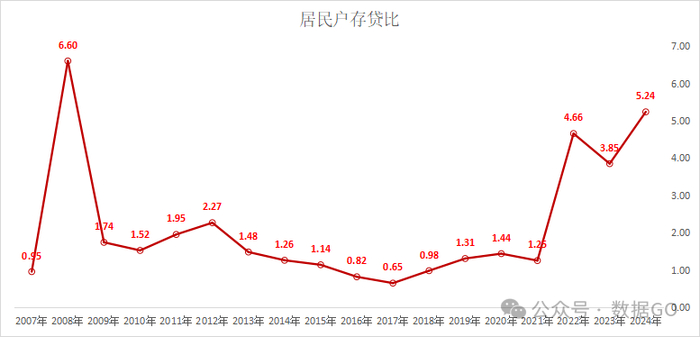2024年,居民存贷比(存款金额/贷款金额)为5.24,高于2023年的4.66。从年度角度看,正常年份的存贷比在0-2之间波动,如果不在这个区间,反映了居民遇到了一些麻烦。目前的数值还不算正常数值。目前的存贷比数据是2008年金融危机以来最高。