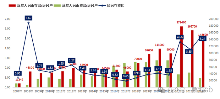 数据显示,居民存款的增长起始于2018年(那一年7.2万亿),爆发于2022年(一年新增17.84万亿)。居民贷款快速增长起始于2016年(6.33万亿),高峰于2021年(7.92万亿),首次崩盘于2022年(3.83万亿),然后是2024年的2.72万亿。
