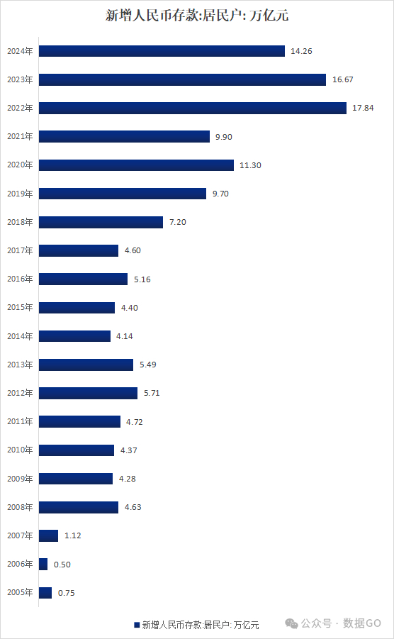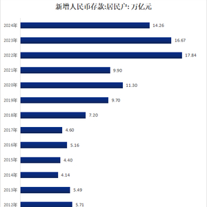 2024年,居民新增存款14.26万亿元,低于2023年的16.67万亿元,但是最近三年每年的增量存款依然处于历史高位。