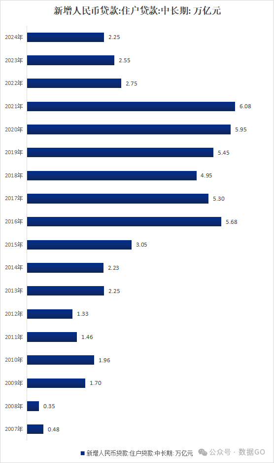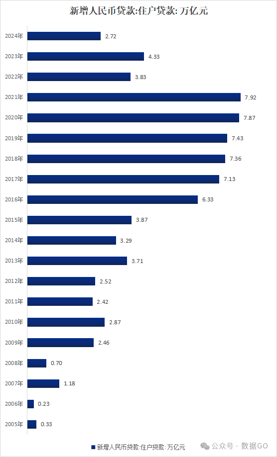 2024年的,居民新增人民币贷款2.72万亿,是2012年以来的最低增量,大幅低于2023年的4.33万元,严重低于往年的7万亿左右。