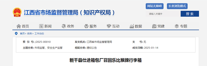 【江西省吉安市】新干县仕途箱包厂召回乐比猴牌行李箱