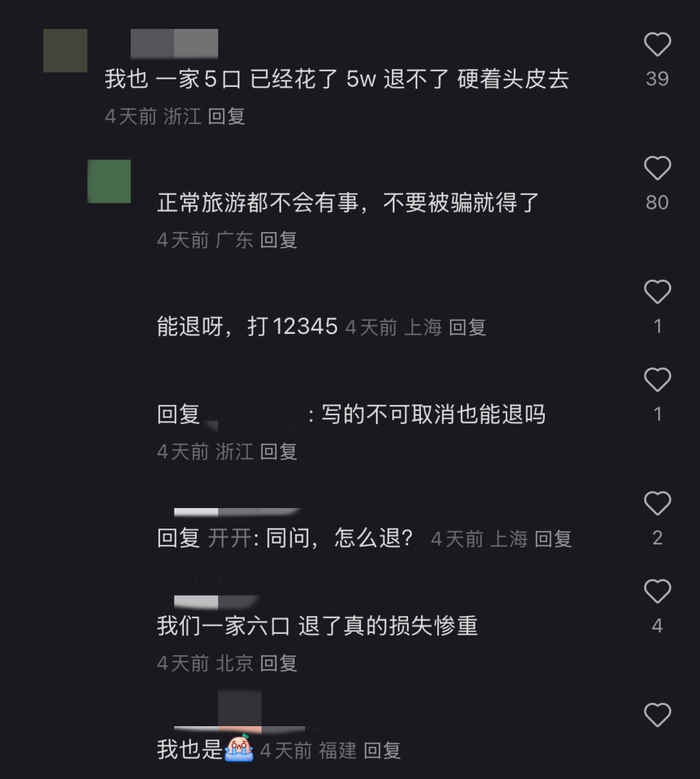 近日在社交平台上,有不少网友都分享了和黄诚类似的经历,有人原计划携一家老小出行,取消后损失高达3万元。相关帖子下的评论区,更多网友相互宽慰“破财免灾”“不怕一万就怕万一”。