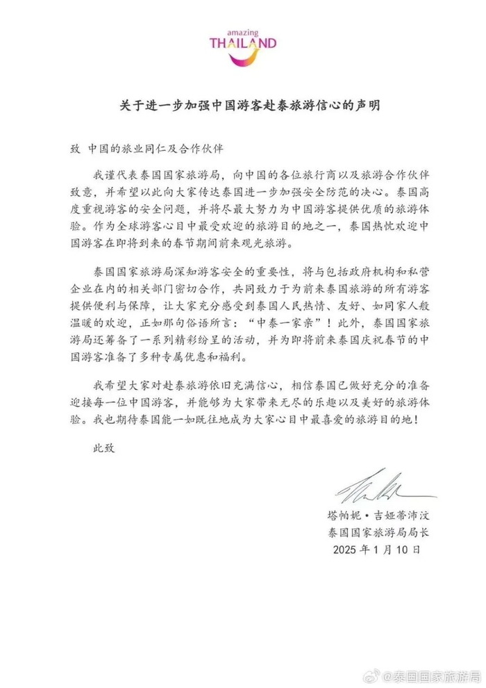 该局局长塔帕妮·吉娅蒂在声明中向中国游客发出邀请:作为全球游客心目中最受欢迎的旅游目的地之一,泰国热忱欢迎中国游客在即将到来的春节期间前来观光旅游。“泰国高度重视游客的安全问题,并将尽最大努力为中国游客提供优质的旅游体验。”