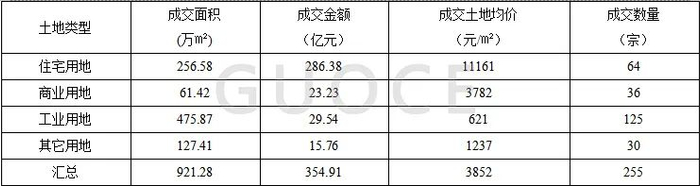 国策机构统计显示,2024年天津市土地成交总面积为921.28万㎡,成交总额为354.91亿元,成交土地均价为3852元/㎡,成交宗数共255宗。其中住宅用地成交64宗,土地面积为256.58万㎡,土地成交金额286.38亿元,成交土地均价11161元/㎡;商服用地成交36宗,土地面积为61.42万㎡,成交金额23.23亿元,成交土地均价3782元/㎡;工业用地成交125宗,土地面积为475.87万㎡,土地成交金额29.54亿元,成交土地均价621元/㎡;其他用地成交30宗,土地面积为127.41万㎡,土地成交金额15.76亿元,成交土地均价1237元/㎡。2024年天津市不同土地类型市场成交情况可见表1、图1、图2: