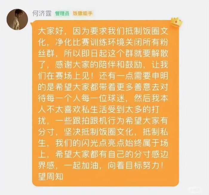 网传截图显示,在粉丝群解散前,国手何济霆给粉丝留言: