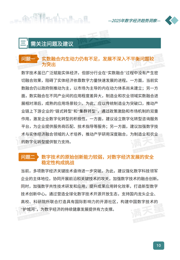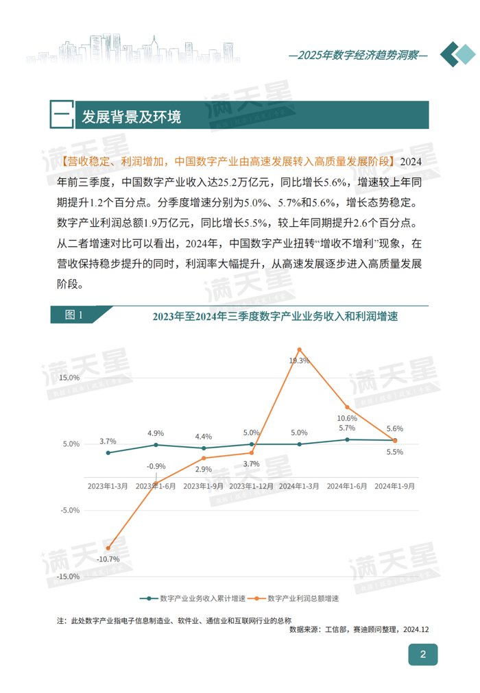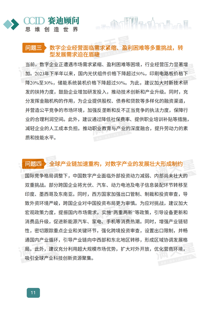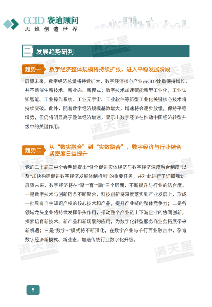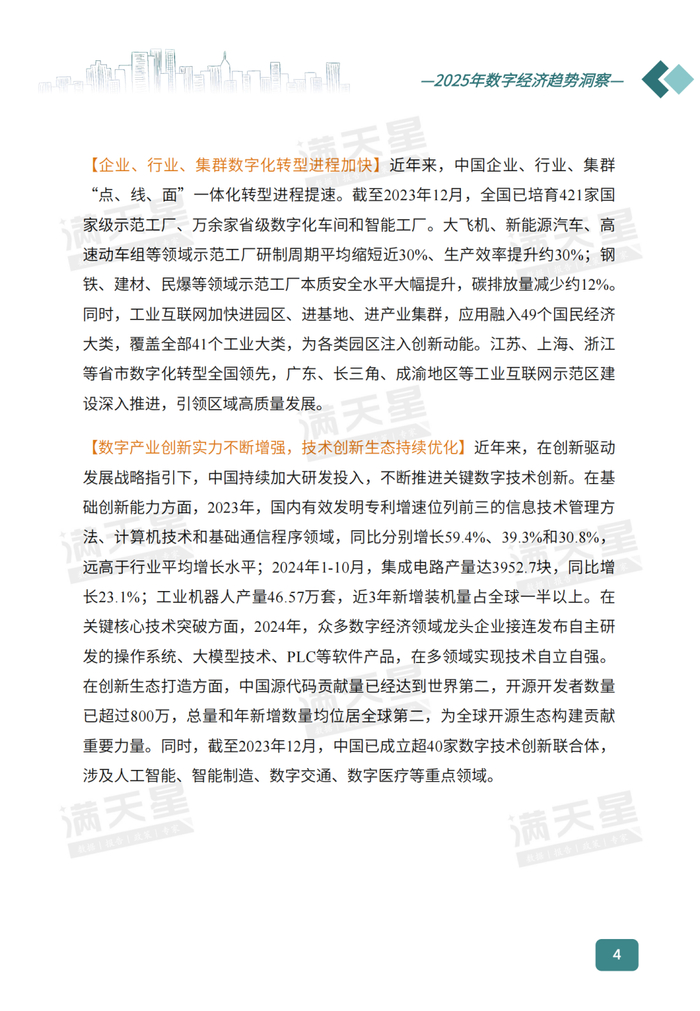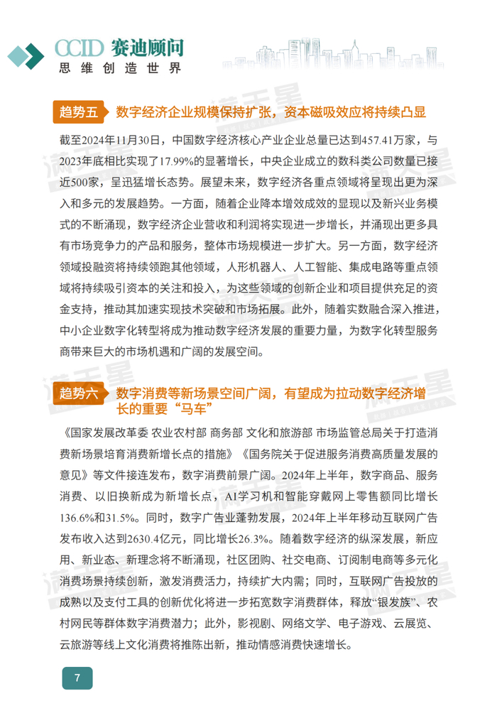 一方面,随着企业降本增效及新兴业务模式的突破,数字经济企业营收和利润将实现进一步增长,涌现出具有市场竞争力的产品和服务。另一方面,数字经济领域投融资将持续领跑,人形机器人、人工智能、集成电路等重点领域将持续吸引资本的关注和投入。此外,随着实数融合深入推进,中小企业数字化转型将为相关服务商带来巨大的市场机遇。