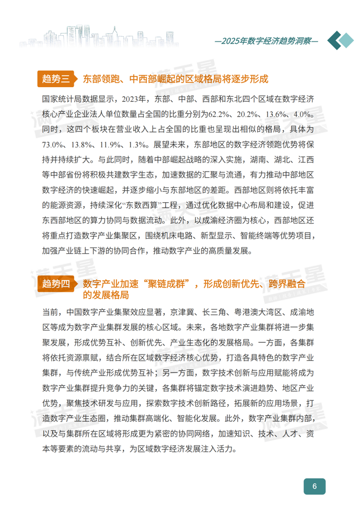 各数字产业集群将形成优势互补、创新优先、产业生态化的发展格局。各集群将依托资源禀赋,打造各具特色的数字产业集群,与传统产业形成优势互补。同时,聚焦技术研发与应用,拓展新的应用场景,打造数字产业生态圈。此外,集群内部以及所在区域将形成更为紧密的协同网络,加速知识、技术、人才、资本等要素的流动与共享。