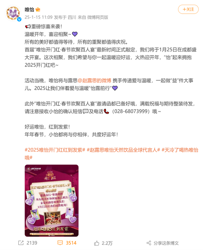 1月15日,某饮品公司官博发布一则活动预告:1月25日在成都盛大开宴,活动当晚,将与露思携手传递爱与温暖,一起做“益”件大事儿。
