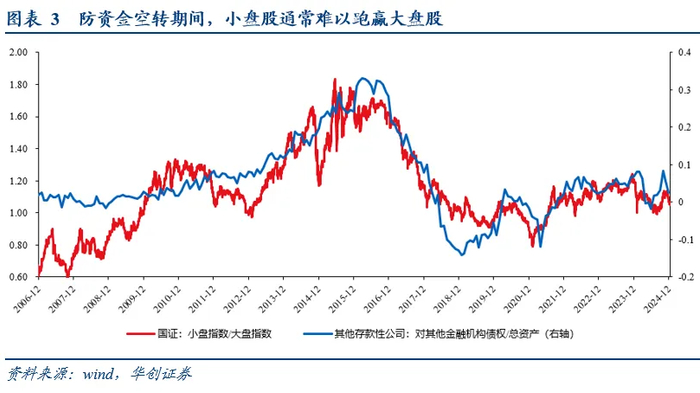 从数据上看,政策防范资金空转的态度,可以跟踪银行向非银投放资金占比这一指标。2014年~2016年期间,彼时央行宽松的货币政策背后,对应着银行每年大约有24%的增量资金流向非银金融机构;2022年~2024年期间,央行适度宽松的货币政策背后,对应着银行每年大约只有5%的增量资金投放至非银体系。历史经验来看,当银行控制向非银投放资金规模时,小盘股通常难以较大盘股跑出相对优势。