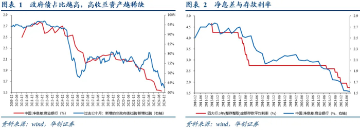 2、政府债占社融比重越高,金融机构资产端的高收益资产越稀缺。社融站在实体部门的视角是实体部门的负债,站在金融机构的视角就是金融机构的资产。由于企业相关负债利率偏高,政府相关负债利率偏低。新增政府债占新增社融的比重越高,就意味着金融机构新增资产的回报越低,这也自然预示着金融机构的高收益资产越来越稀缺。历史经验来看,新增的政府债占社融比重越高(非政府债社融占社融比重越低),商业银行的净息差回落压力也就越大。