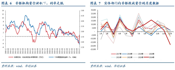 值得注意的是,当下居民的“超额存款”除去流向实体,还需要关注流向非银的可能。参照公式:非银机构新增存款≈非银从银行体系的融资+非银从实体部门(主要是居民)的融资-非银机构向实体的投放。数据来看,2024年,非银机构新增存款同比多增1.2万亿,其中非银从银行体系融资同比少增1.3万亿,从实体部门融资(主要是居民部门)同比多增2.4万亿,向实体部门投放同比基本持平。