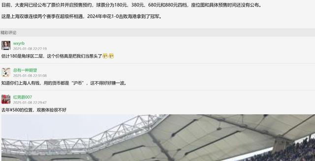 超级杯球票价格,引发申花、海港两队球迷的大讨论。