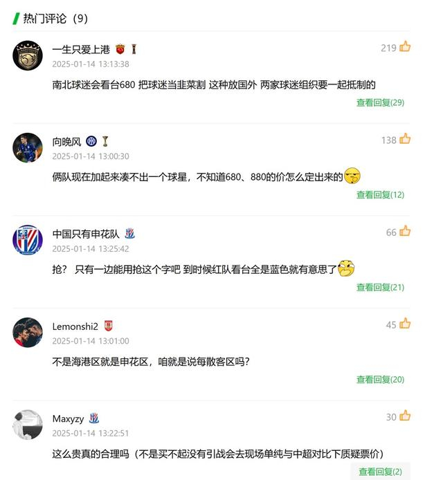 “南北球迷会看台,定价680元,没这个道理的,这是把球迷当韭菜割。这种事情放在欧洲,两家球迷会就算有仇,也会联合起来一起反对。”网友“一生只爱上港”的留言,得到了高票点赞,吸引更多网友加入话题讨论。
