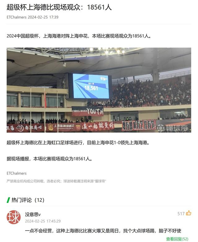 题图说明:即便是2024赛季在上海家门口举办的超级杯,也因为票价偏贵等原因,现场上座率一般。