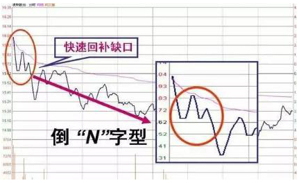 即低开后股价快速上冲到缺口附近,稍有回落后又快速上攻以回补缺口,分时图上也呈现一个“N”字型或“W”走势——说明低开是为了吓出获利盘和套牢盘,当抛盘被买消化后股价开始回到红盘区,显示多头力道强大,当日看涨。