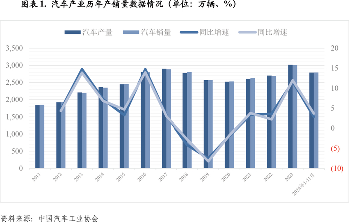 2021年,国内汽车产销量结束三年连续下降的趋势,全年产销量分别完成2608.2万辆和2627.5万辆。2022年,受芯片结构性短缺、动力电池原材料价格高位运行、局部地缘政治冲突等不利因素冲击,在购置税减半等一系列稳增长、促消费政策的有效拉动下,全年汽车产销分别完成2702.1万辆和2686.4万辆。2023年,在新能源汽车和汽车出口增长的拉动下,我国汽车产销量维持增长趋势,汽车产销分别完成3016.1万辆和3009.4万辆,同比分别增长11.6%和12.0%。2024年以来,汽车出口和新能源汽车产销保持快速增长,对汽车产销量增长贡献显著,2024年1-11月,汽车产销分别完成3016.1万辆和3009.4万辆,较去年同比分别增长2.9%和3.7%。