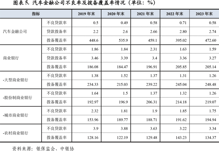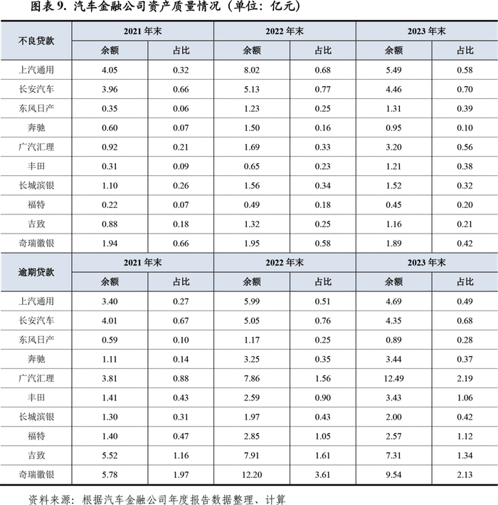 汽车金融公司整体资产质量维持较好水平。近年来,汽车金融公司不良贷款增速高于资产规模增速,汽车金融公司不良率有所波动。2021-2023年末,汽车金融公司不良贷款余额分别为53.41亿元、64.13亿元和50.64亿元。得益于以抵押贷款为主的业务结构和首付比例限制,汽车金融公司贷款核销政策相对灵活,整体资产质量表现各年均优于银行业平均水平。
