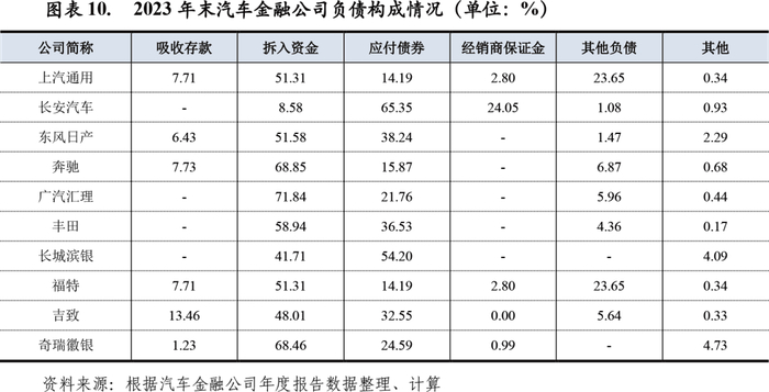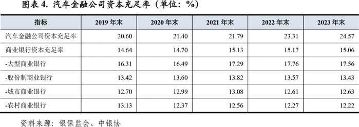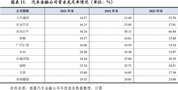 汽车金融公司主要通过发行资产支持证券和金融债券进行直接融资,负债结构仍以金融机构借款为主。从资本充足率情况看,汽车金融公司资本充足率普遍高于监管要求,短期内的资本补充压力较小。