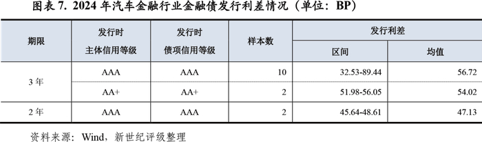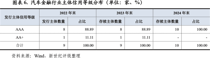 (三)2024年,汽车金融行业发行债券的主体共计6家,存续债券的发行主体共计10家,主体信用等级全部为AAA级,期间行业内1家发债主体信用等级调升至AAA级。