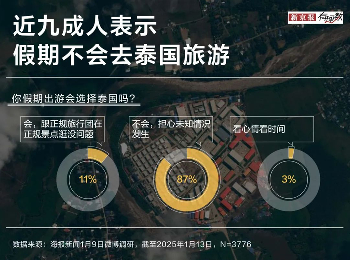 海报新闻发起的一项投票显示,近九成人表示假期不会去泰国旅游。1月13日,根据媒体报道,旅行分析公司ForwardKeys最新数据显示,上周末中国至泰国机票退订量同比猛增155%。