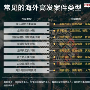 根据外交部领事保护中心联合国家反诈中心、教育部留学服务中心制作发布的《海外防范电信网络诈骗宣传手册》,共有八类常见的海外高发案件类型。在这些纷繁复杂的诈骗类型中,演员被诈骗的遭遇就属于“海外高薪招聘”类。