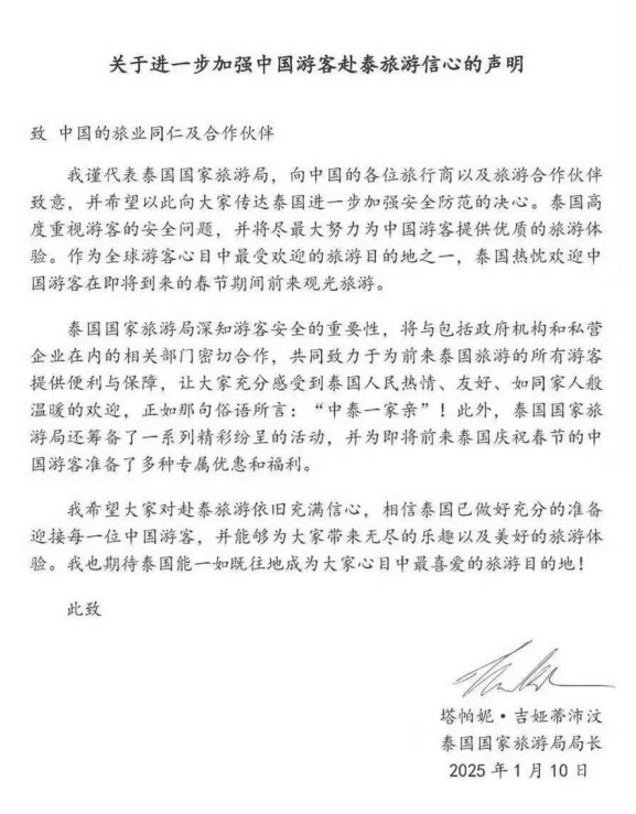为了挽回中国游客的信心,重振旅游业,泰国政府也采取了一系列措施。泰国总理佩通坦表示,将加强并完善相关法律法规,严厉打击各类犯罪事件。警方加大了对旅游景点、机场、酒店等重点场所的安保投入,增加巡逻频次,提升应急处置能力。旅游部门也对旅游从业者加强了管理和培训,要求他们切实提高安全意识,为游客提供更加安全、优质的服务。