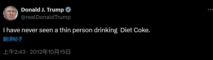 与地球上大多数喝无糖可乐的人一样,特朗普执着于健怡可乐,最初是出于避免肥胖的考虑——但最终似乎抑制不住对这种人造甜味剂饮料的喜爱。