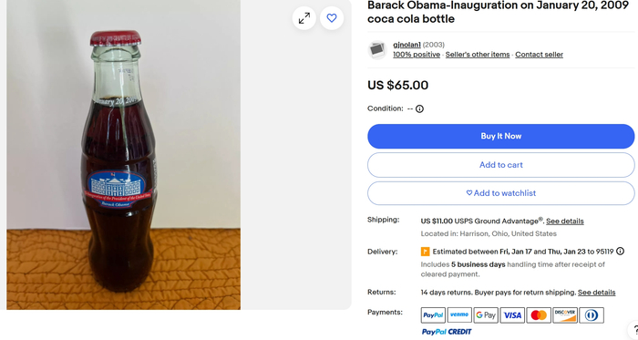 需要解释的是,可口可乐的总统就职纪念瓶并不是特朗普专属。例如在二手网站上未开封的“奥巴马就职纪念可乐瓶”能卖60多美元(甚至连设计都没怎么变)。所以这次的噱头,是公司首次把特朗普最爱的健怡(无糖)可乐做成就职纪念瓶。