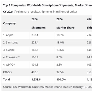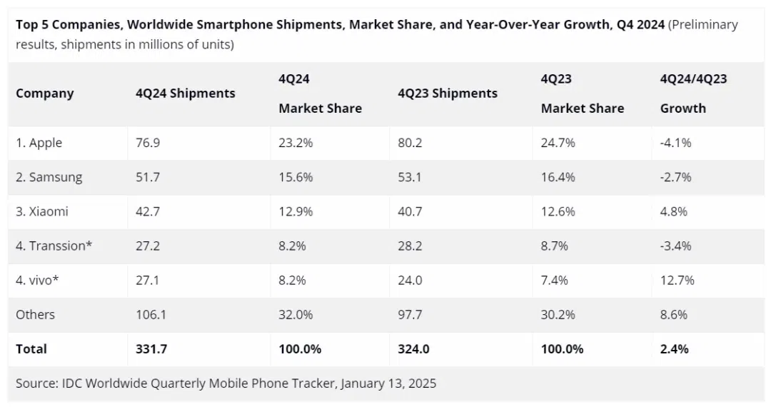 聚焦2024年第四季度全球出货量,IDC数据显示,苹果约为7690万台,同比减少4.1%;三星约为5170万台,同比减少2.7%;小米约为4270万台,同比增长4.8%;传音约为2720万台,同比减少3.4%;vivo约为2710万台,同比增长12.7%。市占率方面,苹果、三星均下滑,小米的全球市场份额升至12.9%。