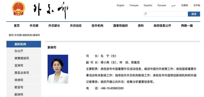 据外交部官网“组织机构”栏目更新信息显示,毛宁已任外交部新闻司司长。