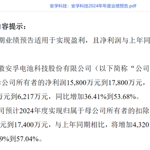 1月14日晚,安孚科技(603031.SH)披露公告称,公司预计2024年实现归母净利润1.58亿元到1.78亿元,同比增长36.41%到53.68%;预计实现扣非归母净利润1.54亿元到1.74亿元,同比增长38.99%到57.04%。