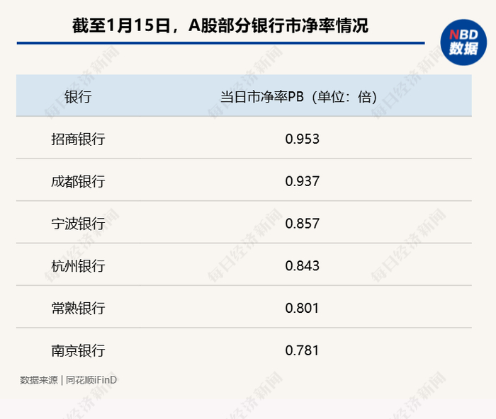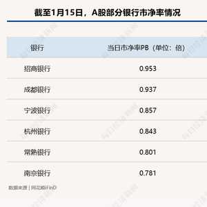 据悉,银行股在2024年实现“普涨”。数据显示,去年申万银行指数涨幅达到34.39%。在银行板块股价稳步上涨带动下,银行股市净率也在逐步回升。目前,同花顺iFinD显示,招商银行市净率为0.953。此外,另有4家A股银行市净率也超过0.8,成都银行目前市净率为0.94、宁波银行为0.86,杭州银行、常熟银行分别为0.84、0.8。