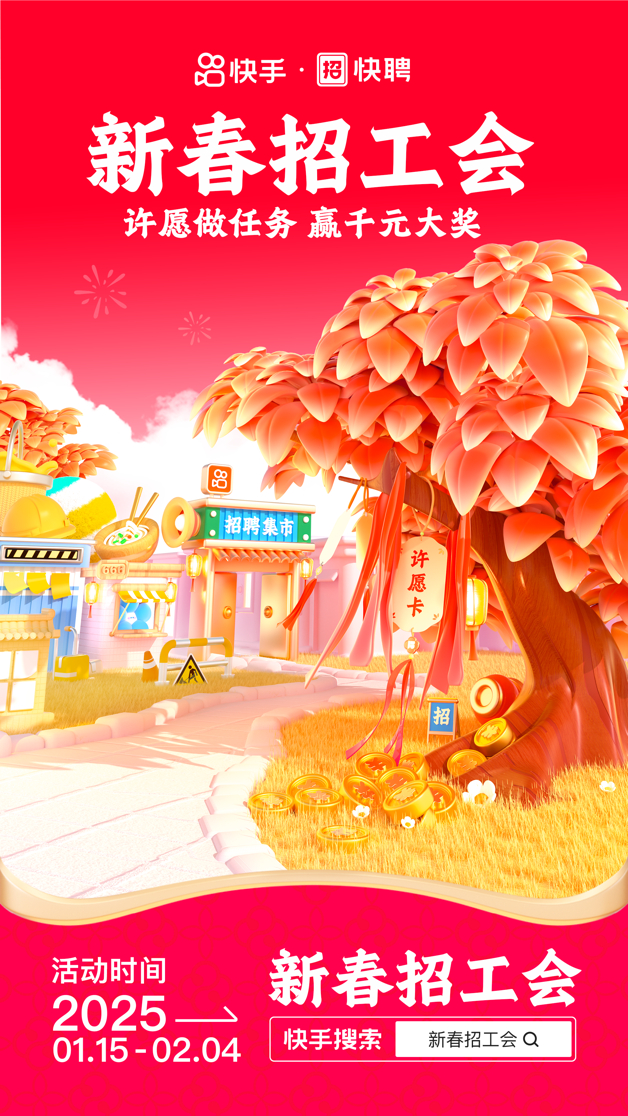 值得一提的是,1月15日至2月4日,快手快聘开启新春招工会场。用户点击许愿树,写下新年求职心愿。参与每日开宝箱抽奖,最高可得1888元现金红包。初一到初七,进入招工墙点击招聘海报,平台精准匹配新春岗位,还愿心仪岗位一键投递,只待开工大吉。
