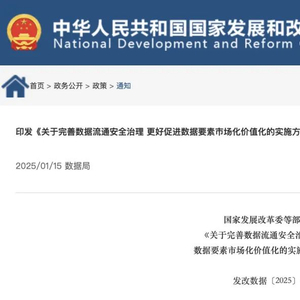 1月15日,为贯彻落实党中央、国务院决策部署,建立健全数据流通安全治理机制,提升数据安全治理能力,促进数据要素合规高效流通利用,国家发展改革委、国家数据局、中央网信办、工业和信息化部、公安部、市场监管总局联合印发了《关于完善数据流通安全治理 更好促进数据要素市场化价值化的实施方案》(以下简称《方案》)。