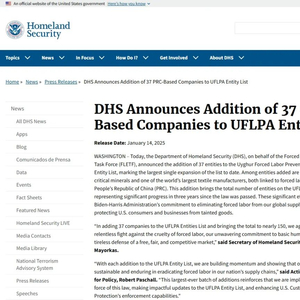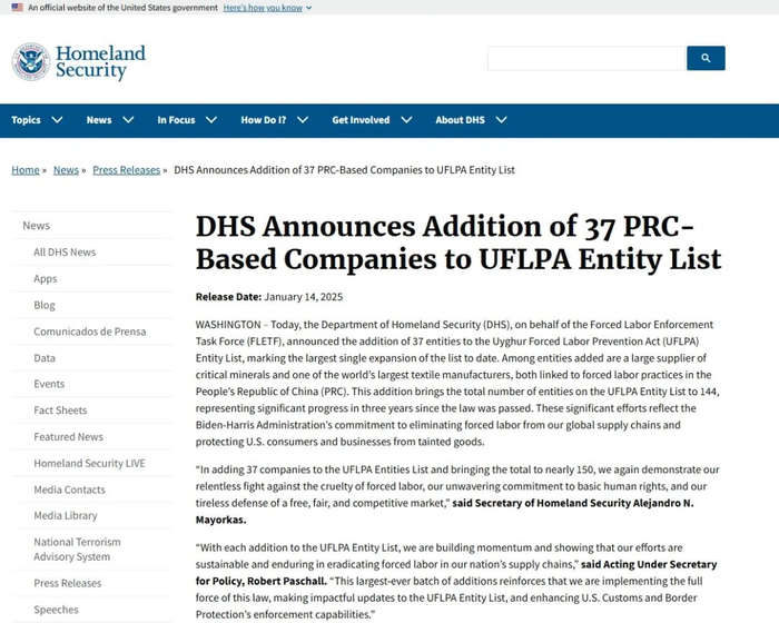 当地时间1月14日,美国国土安全部(DHS)宣布将37家中国公司列入所谓“维吾尔强迫劳动预防法实体清单”(the Uyghur Forced Labor Prevention Act,简称UFLPA)。