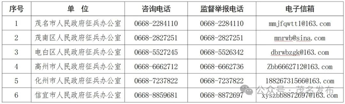 茂名市廉洁征兵监督员名单及监督举报电话、邮箱,请查收!