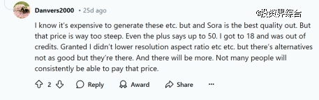 实际上在Sora刚上线的时就有海外用户吐槽Sora价格“太贵了”,生成一个5秒480P视频成本为0.5美元,折合人民币3.63元,生成一段1080p视频成本更是高达27元。