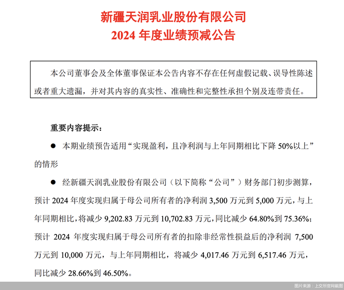 1月14日晚间,天润乳业披露的业绩预减公告显示,预计2024年度归母净利润同比减少64.80%到75.36%。这是天润乳业自2014年以来首次出现连续两年净利润下滑的情况。业内分析人士指出,在上游奶源过剩和终端奶价下行的趋势下,整个乳制品行业面临压力,在“用新疆资源,做全国市场”的新战略下,天润乳业拓展疆外市场、扩大市场份额的同时,也需要面对管理、运营和财务上的复杂性。