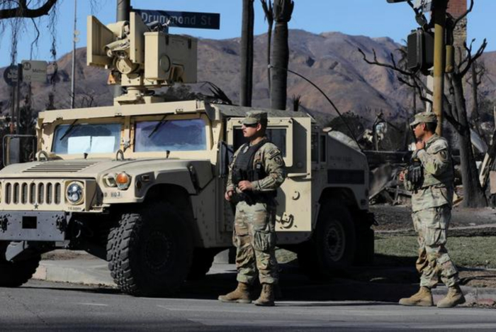 1月13日,美国国民警卫队士兵在洛杉矶地区的“帕利塞兹”山火灾区执勤。图/新华社