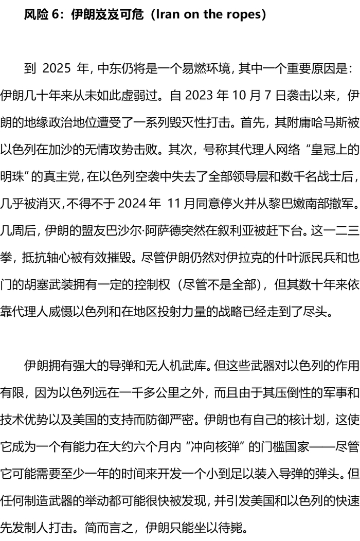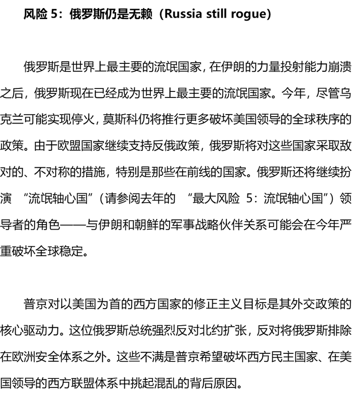 另外,欧亚集团此次在十大风险选择和内容的表述上似乎充满一种“敌对”的情绪,对伊朗和俄罗斯等其成为的“流氓轴心”充满了鄙视,对中国这样的战略竞争对手充满了偏见。这似乎不应该是一家具有国际声望的独立智库应有的风范。