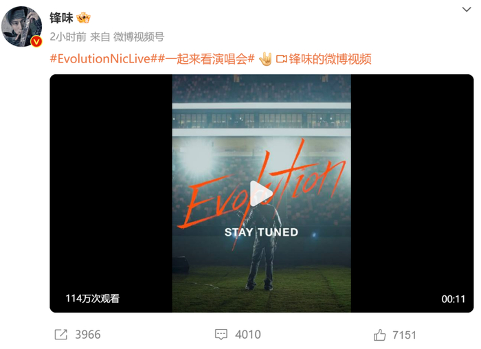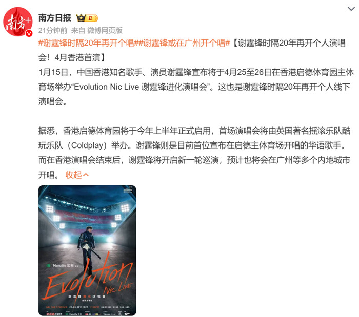 1月15日,中国香港知名歌手、演员谢霆锋在社交账号发布一条演出预告,配文“一起来看演唱会”。谢霆锋将于4月25至26日在香港启德体育园主体育场举办“Evolution Nic Live 谢霆锋进化演唱会”。这也是谢霆锋时隔20年再开个人线下演唱会。