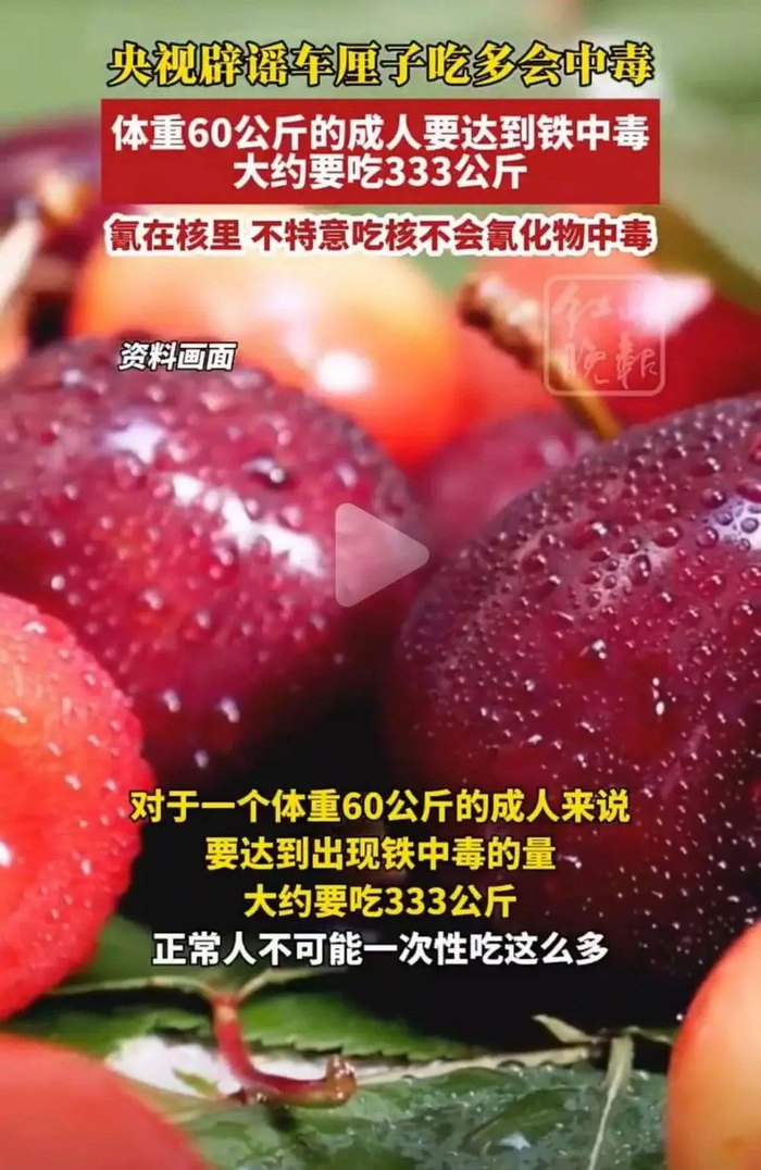 另一种说法更是直接一步到位,称车厘子有毒,吃多了会导致铁中毒和氰化物中毒。这甚至不是网友臆想的原理,而是有一些“专家”的医学支持。现在搜索网上相关新闻,还能看到称车厘子“微毒性”的专家引语。