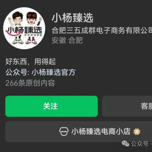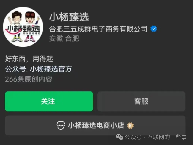 起初,大家还以为这是类似于“疯狂小杨哥”这样的高仿号,但点进去后发现,这是很标准的带货直播间,而且点进主页会发现有小杨臻选的认证,认证公司为“合肥三五成群电子商务有限公司”。