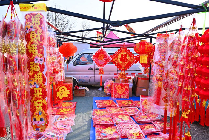 物美价廉是吸引不少顾客赶台湖大集的关键词。在这里,除了里脊烧饼、羊杂汤、刀削面等特色美食,还有农民自产的蔬菜水果,沾着泥土的大葱、萝卜,红润饱满的新鲜草莓,海鲜鱼类、干鲜果品、肉类蛋类等农副产品也一应俱全。红得耀眼的福字、春联更是随处可见,年味儿十足。