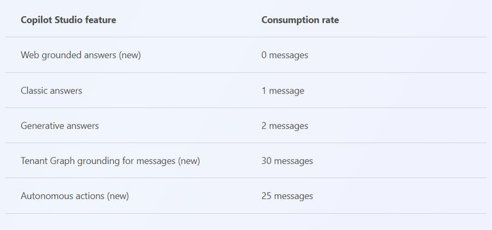 同时,智能体信息的使用情况还因智能体本身的复杂性、频率和特定功能而异。这些功能被分为五类。其中,每次基于用户专有文件、即存储在SharePoint 中的文件和通过Graph连接同步的外部数据作出响应,收费30条消息,智能体代表企业员工采取每个行动收费25条消息。