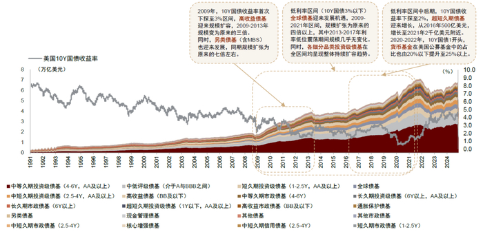 演绎1,美国模式:1)初抵低利率时期,高收益债基率先迎来规模扩容;另类债基,即主要投向次级债、永续债、优先股及MBS等资产的债券基金,同步迎来快速发展。2)贯彻整个低利率区间,全球债基规模明显增长;细分久期和券种的投资级债基在全区间呈现扩容趋势。3)低利率区间中后期,10年期国债收益率步入“1开头”阶段,超短久期债基迎来规模快速增长,货币基金迎来资金增量。4)从公募基金的产品结构变化来看,权益基金长期占据主导地位,债券基金与货币基金市占率维持稳定,截至2024年末合计占比45%左右。