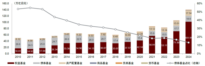截至2024年末,日本债券基金在公募基金中的占比持续压缩至13%附近,货币基金的市占率则仅有0.03%。在债基品类中,全球债基规模占比73%,日本中长久期债基规模占比13%。