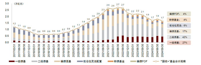 产品结构:最近两年来,“固收+”基金呈现规模萎缩趋势,从2Q22的阶段性峰值2.7万亿元,下行至3Q24的不足1.7万亿元。从产品结构变化来看,二级债基依然占据规模主导地位(42%),随后是一级债基(27%),因仓位相对较低,绝对收益实现能力较强,规模也相对坚挺。股市震荡之下偏债混基规模压缩(17%),低仓位灵活配置(6%)、转债基金(4%)以及偏债FOF(4%)市占率仍在低位。